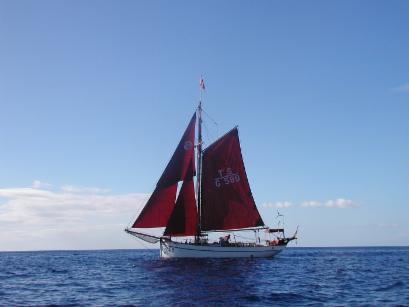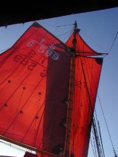 Die erzielten Geschwindigkeiten unter Segel sind in der Regel gleich der Windstaerke in Beauford plus 1. Also z.B. 5 Windstaerken = 6 Kn. Bis 6 Bft. am Wind oder 7 Bft. vor dem Wind, dann muss gerefft werden. Bei guenstigen Wellenverhaeltnissen koennen bis zu 8 kn erreicht werden. Alle Schoten 22 mm doppelgeflochtenes Polyestertauwerk, alles uebrige Tauwerk Roblon. Die Bloecke sind alle aus Esche.