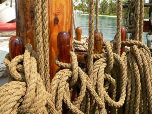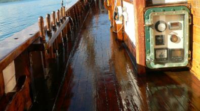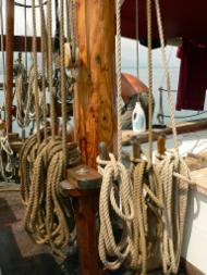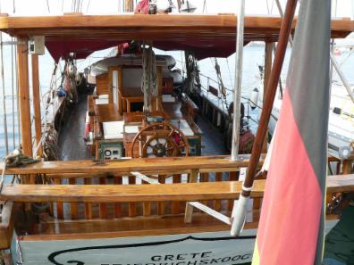 Es kann somit sowohl Kompass-Mode, Wind-Mode oder Waypoint-Mode auf die Selbststeueranlage geschaltet werden. Im Heckbereich befinden sich dann noch drei Backskisten, die zusammen mit einer ueber die ganze Schiffsbreite laufenden Rueckenlehne eine bequeme Bank bilden. Hinter der Bank bilden dann die Bottsdavids (aus schwerer Eiche) den Abschluss. Quer ueber die Bootsdavids liegen zwei Eichenplanken auf denen der Wingenerator, die GPS Antenne, Typhon, Hecklaterne, Hummingbird-Fischfinder und Flaggenstock angebracht sind. Ueber dem Steuerstand und der Heckbank wurde erst kuerzlich ein Dach aus Teackholz errichtet, auf dem die 9 Solarpaneele untergebracht sind. Hier wird auch der Grossbaum abgelegt, wenn sich das Schiff im Hafen oder auf Reede befindet, oder auf See mit der Breitfock gesegelt wird. Von der Vorkannte dieses Daches bis zum Mast kann ein Sonnensegel gespannt werden. Vor dem Mast – bis zum Fockstag – kann ebenfalls ein kleineres Sonnensegel aufgebracht werden. Bleibt noch der Klueverbaum zu erwaehnen, auf dem – an einem Ring – ein zweites Klueverstag angebracht ist, sodass der Kluever (wie auch alle anderen Segel) von Deck aus gesetzt und geborgen werden kann und keiner ins Kluevernetz klettern muss. Es handelt sich hier um eine Eigenkonstruktion, die die Sicherheit der Besatzung zum Ziel hat.