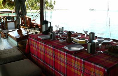 Vor dem Mast das Vorluk als Schiebeluk, dahinter der Mittschiffsaufbau mit der 6 Personen Ret tungsinsel von Viking, dahinter eine Dachflaeche bis zum Niedergang von 2,00 x 1,40 m , Platz also fuer zwei Matratzen, wenn man bei schoenem Wetter gerne mal an Deck schlafen will. Hinter dem Niedergang drei Backskisten in U-Form, in deren Mitte ein massiver Teakholztisch Platz fuer 8 Personen bietet.